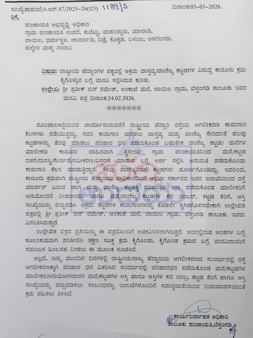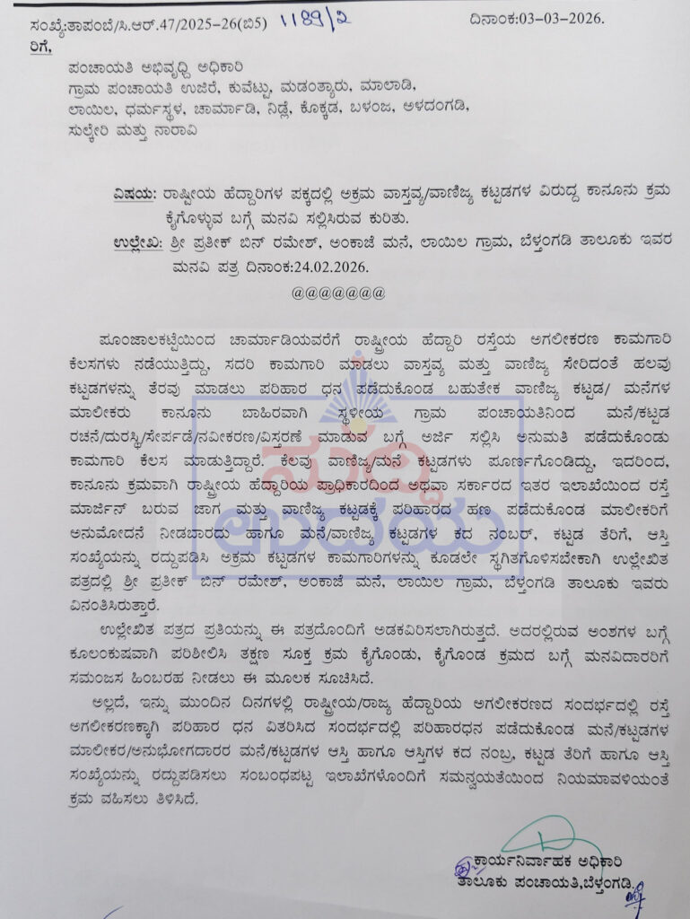 ಪೂಂಜಾಲಕಟ್ಟೆಯಿಂದ ಚಾರ್ಮಾಡಿಯವರೆಗೆ ರಾಷ್ಟ್ರೀಯ ಹೆದ್ದಾರಿ ರಸ್ತೆಯ ಅಗಲೀಕರಣ ಕಾಮಗಾರಿ ಕೆಲಸಗಳು ನಡೆಯುತ್ತಿದ್ದು, ಸದರಿ ಕಾಮಗಾರಿ ಮಾಡಲು ವಾಸ್ತವ್ಯ ಮತ್ತು ವಾಣಿಜ್ಯ ಸೇರಿದಂತೆ ಹಲವು ಕಟ್ಟಡಗಳನ್ನು ತೆರವು ಮಾಡಲು ಪರಿಹಾರ ಧನ ಪಡೆದುಕೊಂಡ ಬಹುತೇಕ ವಾಣಿಜ್ಯ ಕಟ್ಟಡ, ಮನೆಗಳ ಮಾಲೀಕರು ಕಾನೂನು ಬಾಹಿರವಾಗಿ ಸ್ಥಳೀಯ ಗ್ರಾಮ ಪಂಚಾಯತಿನಿಂದ ಮನೆ, ಕಟ್ಟಡ ರಚನೆ, ದುರಸ್ಥಿ, ಸೇರ್ಪಡೆ, ನವೀಕರಣ, ವಿಸ್ತರಣೆ ಮಾಡುವ ಬಗ್ಗೆ ಅರ್ಜಿ ಸಲ್ಲಿಸಿ ಅನುಮತಿ ಪಡೆದುಕೊಂಡು ಕಾಮಗಾರಿ ಕೆಲಸ ಮಾಡುತ್ತಿದ್ದಾರೆ. ಆದರೆ ಕಾನೂನು ಕ್ರಮವಾಗಿ ರಾಷ್ಟ್ರೀಯ ಹೆದ್ದಾರಿಯ ಪ್ರಾಧಿಕಾರದಿಂದ ಪರಿಹಾರದ ಹಣ ಪಡೆದುಕೊಂಡ ಮಾಲೀಕರಿಗೆ ಅನುಮೋದನೆ ನೀಡಬಾರದು ಹಾಗೂ ಮನೆ, ವಾಣಿಜ್ಯ ಕಟ್ಟಡಗಳ ಕದ ನಂಬರ್, ಕಟ್ಟಡ ತೆರಿಗೆ, ಆಸ್ತಿ ಸಂಖ್ಯೆಯನ್ನು ರದ್ದುಪಡಿಸಿ ಅಕ್ರಮ ಕಟ್ಟಡಗಳ ಕಾಮಗಾರಿಗಳನ್ನು ಕೂಡಲೇ ಸ್ಥಗಿತಗೊಳಿಸಬೇಕಾಗಿ ಪ್ರತೀಕ್ ಅಂಕಾಜೆ ಇವರು ಮನವಿ ಮಾಡಿದ್ದು, ಇದರ ಬಗ್ಗೆ ಕೂಲಂಕುಷವಾಗಿ ಪರಿಶೀಲಿಸಿ ತಕ್ಷಣ ಸೂಕ್ತ ಕ್ರಮ ಕೈಗೊಳ್ಳುವಂತೆ ಉಜಿರೆ, ಕುವೆಟ್ಟು, ಮಡಂತ್ಯಾರು, ಧರ್ಮಸ್ಥಳ, ಚಾರ್ಮಾಡಿ, ನಿಡ್ಲೆ, ಕೊಕ್ಕಡ, ಬಳಂಜ, ಅಳದಂಗಡಿ, ಸುಲ್ಕೇರಿ ಮತ್ತು ನಾರಾವಿಎ ಪಂಚಾಯತುಗಳಿಗೆ ಕಳುಹಿಸಿದ ಆದೇಶದಲ್ಲಿ ಸೂಚಿಸಲಾಗಿದೆ.