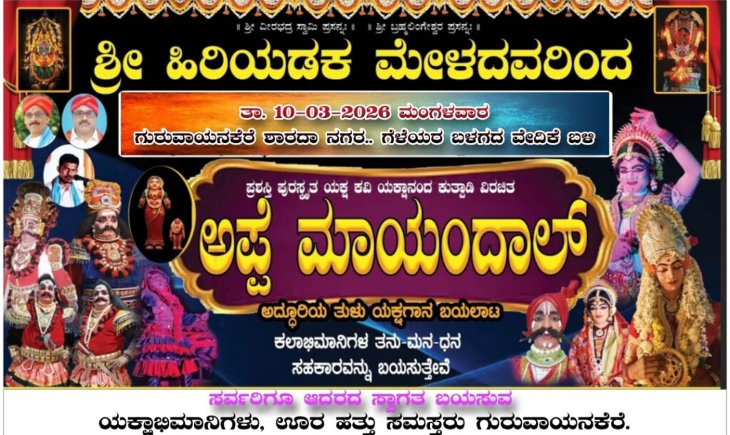 ಗುರುವಾಯನಕೆರೆ: ಗುರುವಾಯನಕೆರೆ ಶಾರದಾ ನಗರ ಗೆಳೆಯರ ಬಳಗದ ವೇದಿಕೆ ಬಳಿ ಶ್ರೀ ಹಿರಿಯಡಕ ಮೇಳದವರಿಂದ ಪ್ರಶಸ್ತಿ ಪುರಸ್ಕೃತ ಯಕ್ಷ ಕವಿ ಯಕ್ಷಾನಂದ ಕುತ್ಪಾಡಿ ವಿರಚಿತ ‘ಅಪ್ಪೆ ಮಾಯಂದಾಲ್’