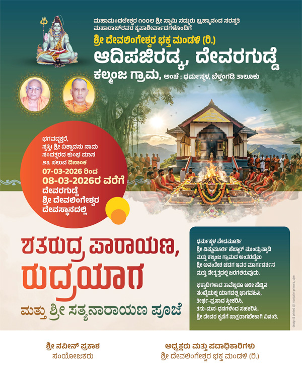 ಕಲ್ಮಂಜ: ಕನ್ಯಾಡಿ ಮಹಾಮಂಡಲೇಶ್ವರ 1008 ಶ್ರೀ ಸ್ವಾಮಿ ಸದ್ಗುರು ಬ್ರಹ್ಮಾನಂದ ಸರಸ್ವತಿ ಮಹಾರಾಜ್ ರವರ ಆಶೀರ್ವಾದದೊಂದಿಗೆ, ಧರ್ಮಸ್ಥಳ ವೇದಮೂರ್ತಿ ವಿಷ್ಣುಮೂರ್ತಿ ಹೆಬ್ಬಾರ್ ಮಂಡ್ರಪ್ಪಾಡಿ ಮತ್ತು ಕಲ್ಮಂಜ ಗ್ರಾಮದ ಅಂತರಬೈಲು ಅನಂತೇಶ್ ಚಡಗ ಇವರ ಮಾರ್ಗದರ್ಶನ ಮತ್ತು ನೇತೃತ್ವದಲ್ಲಿ ಪುರಾತನ ದೇವಾಲಯ ಆದಿಪಜಿರಡ್ಕ ಶ್ರೀ ದೇವಲಿಂಗೇಶ್ವರ ದೇವಸ್ಥಾನದಲ್ಲಿ ಮಾ.7ರಿಂದ ಮಾ.8 ರವರೆಗೆ ಶತರುದ್ರ ಪಾರಾಯಣ, ರುದ್ರಯಾಗ ಮತ್ತು ಶ್ರೀ ಸತ್ಯನಾರಾಯಣ ಪೂಜೆ ನಡೆಯಲಿರುವುದು.