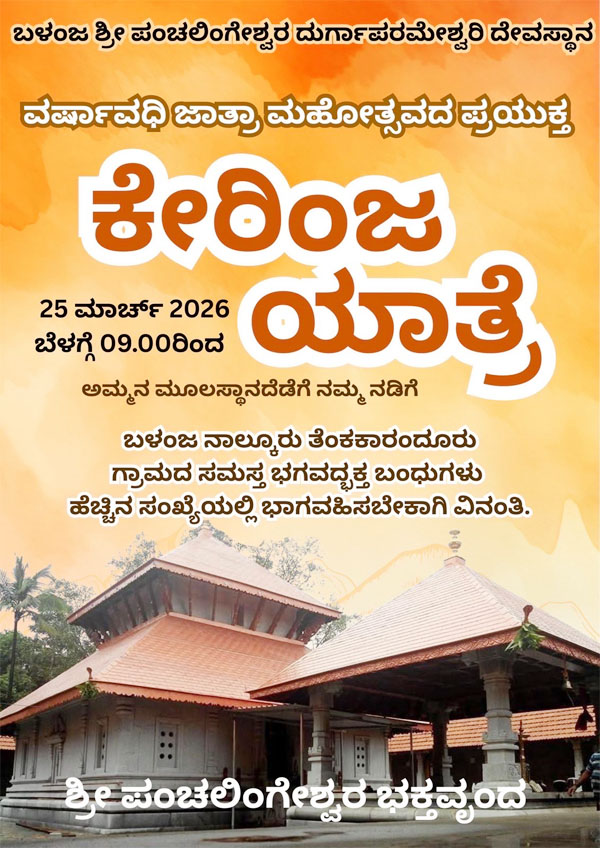 ಬೆಳ್ತಂಗಡಿ: ದಕ್ಷಿಣ ಕನ್ನಡ ಜಿಲ್ಲೆಯ ಬೆಳ್ತಂಗಡಿ ತಾಲೂಕಿನ ಸುಕ್ಷೇತ್ರ ಬಳಂಜದ ಶ್ರೀ ಪಂಚಲಿಂಗೇಶ್ವರ ಹಾಗೂ ದುರ್ಗಾಪರಮೇಶ್ವರಿ ದೇವಸ್ಥಾನದಲ್ಲಿ 2026ರ ಮಾರ್ಚ್ 19 ರಿಂದ ಮಾರ್ಚ್ 25ರ ವರೆಗೆ ವಾರ್ಷಿಕ ಜಾತ್ರೋತ್ಸವವು ಅತ್ಯಂತ ಸಡಗರ-ಸಂಭ್ರಮದಿಂದ ನಡೆಯಲಿದೆ.