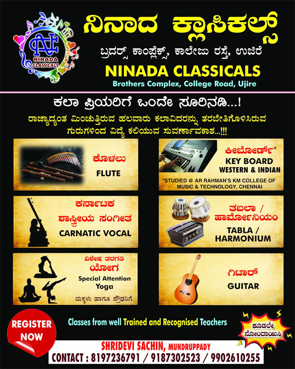 ನಿನಾದ ಕ್ಲಾಸಿಕಲ್ಸ್ ಕೊಳಲು, ಕೀಬೋರ್ಡ್, ಕರ್ನಾಟಕ, ಶಾಸ್ತ್ರೀಯ ಸಂಗೀತ, ತಬಲಾ, ಹಾರ್ಮೋನಿಯಂ, ವಿಶೇಷ ತರಗತಿ ಯೋಗ, ಗಿಟಾರ್ ತರಬೇತಿಯನ್ನು ಉತ್ತಮ ತರಬೇತಿ ಪಡೆದ ಮತ್ತು ಗುರುತಿಸಲ್ಪಟ್ಟ ಗುರುಗಳಿಂದ ಕಲಿಸಿ ಕೊಡಲಾಗುವುದು. ಆಸಕ್ತಿವುಳ್ಳವರು ಈ ಕೂಡಲೇ ನೋಂದಾಯಿಸಬಹುದು ಎಂದು ಶ್ರೀದೇವಿ ಸಚಿನ್ ಮುಂಡ್ರುಪ್ಪಾಡಿ ತಿಳಿಸಿರುತ್ತಾರೆ.