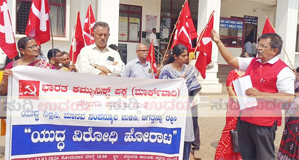 ಯುದ್ದ ಖಂಡಿಸಿ ಬೆಳ್ತಂಗಡಿ ತಾಲೂಕು ಕಚೇರಿ ಎದುರು ಸಿಐಟಿಯು ಸೇರಿದಂತೆ ವಿವಿಧ ಸಂಘಟನೆಗಳ‌ ಪ್ರತಿಭಟನೆ