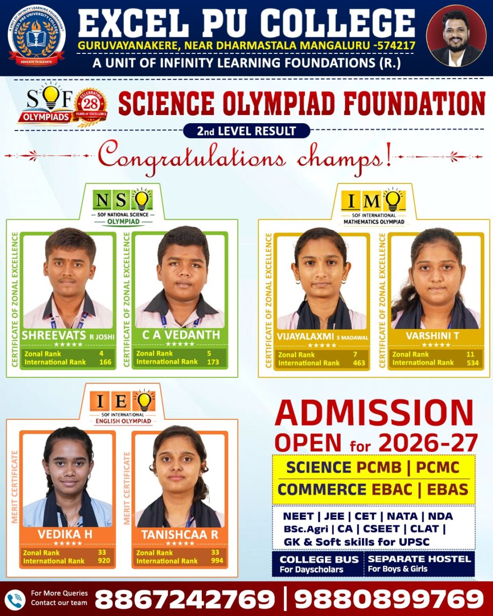 ಎಕ್ಸೆಲ್ ಪಿಯು ಕಾಲೇಜಿನ ವಿದ್ಯಾರ್ಥಿಗಳ ಅದ್ಭುತ ಸಾಧನೆ: ಸೈನ್ಸ್ ಒಲಿಂಪಿಯಾಡ್ ಫೌಂಡೇಶನ್ – 2ನೇ ಹಂತದ ಫಲಿತಾಂಶ ಅಮೋಘ ದಾಖಲೆ: ವಿದ್ಯಾರ್ಥಿಗಳ ಪರಿಶ್ರಮ,ಶಿಕ್ಷಕರ ಮಾರ್ಗದರ್ಶನ,ಪೋಷಕರ ಬೆಂಬಲದಿಂದ ಈ ಸಾಧನೆ: ಸುಮಂತ್ ಕುಮಾರ್ ಜೈನ್