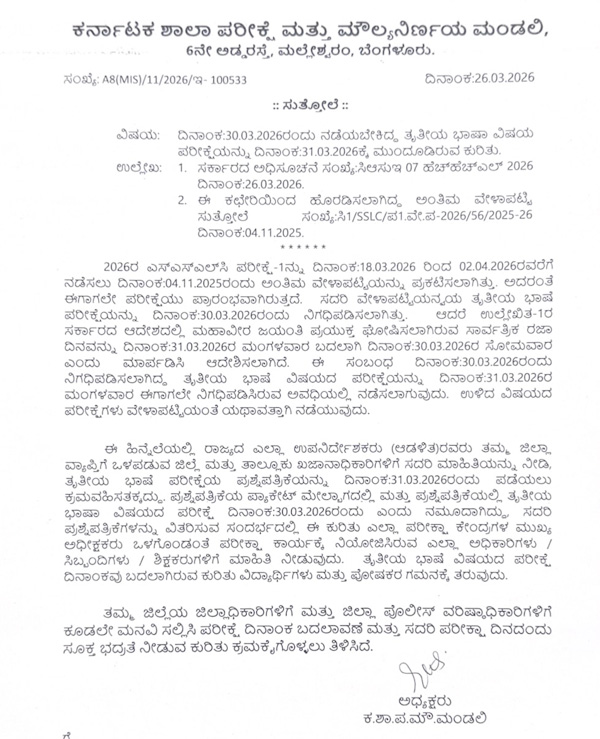 2026ರ ಎಸ್‌ಎಸ್‌ಎಲ್‌ಸಿ ಪರೀಕ್ಷೆ-1ನ್ನು ಮಾ. 18 ರಿಂದ ಎ.2ರವರೆಗೆ ನಡೆಸಲು ಕರ್ನಾಟಕ ಶಾಲಾ ಪರೀಕ್ಷೆ ಮತ್ತು ಮೌಲ್ಯ ನಿರ್ಣಯ ಮಂಡಳಿ ಅಂತಿಮ ವೇಳಾಪಟ್ಟಿಯನ್ನು ಪ್ರಕಟಿದ್ದು, ಅದರಂತೆ ಈಗಾಗಲೇ ಪರೀಕ್ಷೆ ನಡೆಯುತ್ತಿದೆ. ಸದರಿ ವೇಳಾಪಟ್ಟಿಯನ್ವಯ ತೃತೀಯ ಭಾಷೆ ಪರೀಕ್ಷೆಯನ್ನು ಮಾ. ೩೦ರಂದು ನಿಗಧಿಪಡಿಸಲಾಗಿತ್ತು. ಆದರೆ ಸರ್ಕಾರದ ಅಧಿಸೂಚನೆ ಸಂಖ್ಯೆ:ಸಿಆಸುಇ 07 ಹೆಚ್‌ಹೆಚ್‌ಎಲ್ 2026 ದಿನಾಂಕ:26-03-2026 ರನ್ನಯ ಮಹಾವೀರ ಜಯಂತಿ ಪ್ರಯುಕ್ತ ಘೋಷಿಸಲಾಗಿರುವ ಸಾರ್ವತ್ರಿಕ ರಜಾ ದಿನವನ್ನು ಮಾ.31 ಮಂಗಳವಾರ ಬದಲಾಗಿ ಮಾ.30 ಸೋಮವಾರ ಎಂದು ಮಾರ್ಪಡಿಸಿ ಆದೇಶಿಸಲಾಗಿದೆ.