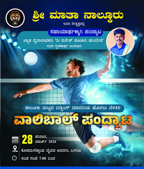 ಬಳಂಜ: ಶ್ರೀ ಮಾತಾ ನಾಲ್ಕೂರು ಇವರ ನೇತೃತ್ವದಲ್ಲಿ ಸಹಾಯಾರ್ಥಕ್ಕಾಗಿ ಪಂದ್ಯಾಟ ಖ್ಯಾತ ದೈವರಾಧಕ ದಿ. ಸುರೇಶ್ ಪೂಜಾರಿ ಹುಂಬೇಜೆ ಇವರ ಸ್ಮರಣಾರ್ಥ ಅಂಗವಾಗಿ ತಾಲೂಕು ಮಟ್ಟದ ಬಿಡ್ಡಿಂಗ್ ಮಾದರಿಯ ಹೊನಲು ಬೆಳಕಿನ ವಾಲಿಬಾಲ್ ಪಂದ್ಯಾಟ ಮಾ.28ರಂದು ಸಂಜೆ ಕೊಡಮಣಿತ್ತಾಯ ದೈವದ ಆವರಣ ಬಳಂಜದಲ್ಲಿ ನಡೆಯಲಿದೆ.