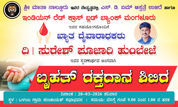 ಬಳಂಜ: ಶ್ರೀ ಮಾತಾ ನಾಲ್ಕೂರು ಇವರ ನೇತೃತ್ವದಲ್ಲಿ ಎಸ್‌ಡಿಎಂ ಆಸ್ಪತ್ರೆ ಉಜಿರೆ ಹಾಗೂ ಇಂಡಿಯನ್ ರೆಡ್ ಕ್ರಾಸ್ ಬ್ಲಡ್ ಬ್ಯಾಂಕ್ ಮಂಗಳೂರು ಇವರ ಸಹಯೋಗದೊಂದಿಗೆ ಖ್ಯಾತ ದೈವಾರಾಧಕ ದಿ. ಸುರೇಶ್ ಪೂಜಾರಿ ಹುಂಬೇಜೆ ಇವರ ಸ್ಮರಣಾರ್ಥ ಅಂಗವಾಗಿ ಬೃಹತ್ ರಕ್ತದಾನ ಶಿಬಿರವು ಮಾ.28ರಂದು ಬಳಂಜ ಗ್ರಾಮ ಪಂಚಾಯತ್ ಸಭಾಭವನದಲ್ಲಿ ಜರುಗಲಿದೆ.