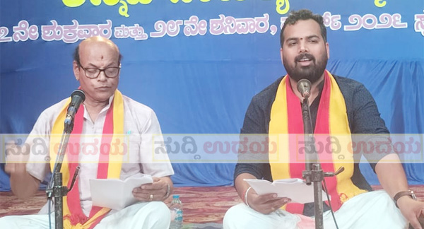 ಬೆಳ್ತಂಗಡಿ: ಬಂಟ್ವಾಳದಲ್ಲಿ ನಡೆದ 28ನೇ ದಕ್ಷಿಣ ಕನ್ನಡ ಜಿಲ್ಲಾ ಸಾಹಿತ್ಯ ಸಮ್ಮೇಳನದಲ್ಲಿ’ ಕೃಷ್ಣ ಭಕ್ತಿ ‘ಎಂಬ ಕುಮಾರವ್ಯಾಸ ಭಾರತದ ಭಾಗದ ಗಮಕವಾಚನವನ್ನು ಗಮಕಿ ಮಧೂರು ವಿಷ್ಣು ಪ್ರಸಾದ ಕಲ್ಲುರಾಯ ಮತ್ತು ವ್ಯಾಖ್ಯಾನವನ್ನು ಪ್ರೊ. ಮಧೂರು ಮೋಹನ ಕಲ್ಲೂರಾಯ ನಡೆಸಿಕೊಟ್ಟರು.