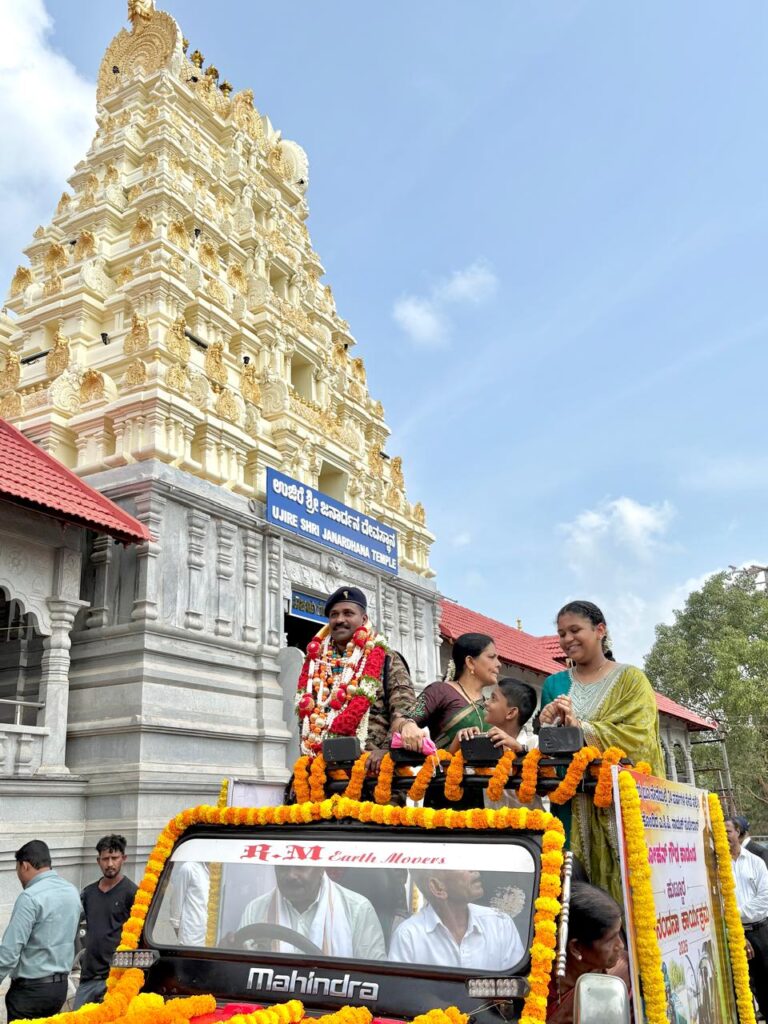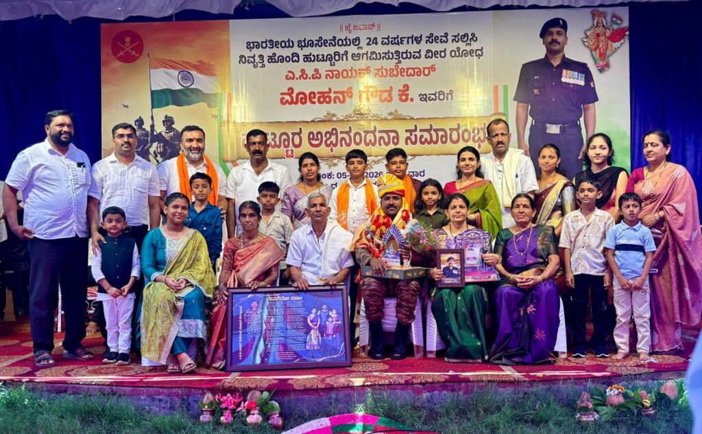ಬೆಳಾಲು: ಎ.ಸಿ.ಪಿ. ನಾಯಕ ಸುಬೇದಾ‌ರ್ ಮೋಹನ್‌ ಗೌಡ ರವರಿಗೆ ಹುಟ್ಟೂರ ಅಭಿನಂದನೆ-ಉಜಿರೆಯಿಂದ ಸ್ವಾಗತ ಮೆರವಣಿಗೆ