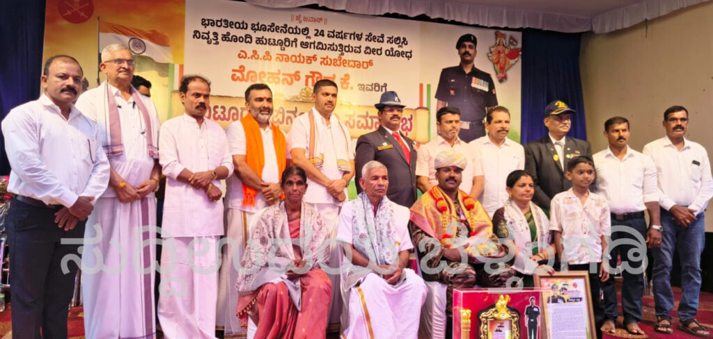 ಬೆಳಾಲು : ಭಾರತ ದೇಶದ ರಕ್ಷಣಾ ವಿಭಾಗದ ಭೂ ಸೇನೆಯಲ್ಲಿ 24 ವರ್ಷ ಸೇವೆ ಸಲ್ಲಿಸಿ ನಿವೃತ್ತಿ ಹೊಂದಿ ಹುಟ್ಟೂರಿಗೆ ಆಗಮಿಸಿದ ಬೆಳಾಲು ಗ್ರಾಮದ ಕಾಡಂಡ ನಿವಾಸಿ ವೀರ ಯೋಧ ಎ. ಸಿ. ಪಿ. ನಾಯಕ ಸುಬೇದಾ‌ರ್ ಮೋಹನ ಗೌಡ ಇವರಿಗೆ ಬೆಳಾಲು ಗ್ರಾಮದ ವಿವಿಧ ಸಂಘ ಸಂಸ್ಥೆಗಳ, ಊರವರ ಸಹಕಾರದಲ್ಲಿ ಅಭಿನಂದನಾ ಸಮಿತಿ ವತಿಯಿಂದ ಎ.5ರಂದು ಹುಟ್ಟೂರ ಅಭಿನಂದನಾ ಸಮಾರಂಭ ಬೆಳಾಲು ಶ್ರೀ ಧ. ಮಂ. ಪ್ರೌಢ ಶಾಲೆಯಲ್ಲಿ ನಡೆಯಿತು.