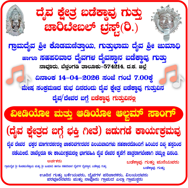 ಎ.14: ದೈವ ಕ್ಷೇತ್ರ ಬಡೆಕ್ಕಾವು ಗುತ್ತುವಿನ ದೈವ/ದೇವರ ವೀಡಿಯೋ ಮತ್ತು ಆಡಿಯೋ ಆಲ್ಬಮ್‌ ಸಾಂಗ್ ಬಿಡುಗಡೆ