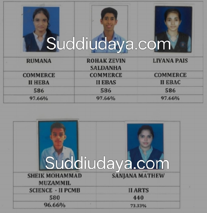 ಕಲಾ ವಿಭಾಗದಲ್ಲಿ ಸಂಜನಾ ಮ್ಯಾತ್ಯು 440, ವಾಣಿಜ್ಯ ವಿಭಾಗ ರೂಹನ್ಹ 586,ರೋಹಕ್ ಝೆವಿನ ಸಾಲ್ದಾನ 586,ಲಿಯನ್ನ ಪೈಸ್ 586,ವಿಜ್ಞಾನ ವಿಭಾಗ ಶೇಕ್ ಮೊಹಮ್ಮದ್ ಮುಝಮಿಲ್ 580ಅಂಕ ದೊಂದಿಗೆ ಅತೀ ಹೆಚ್ಚು ಅಂಕ ಗಳಿಸಿದ ವಿದ್ಯಾರ್ಥಿಗಳಾಗಿದ್ದಾರೆ.
