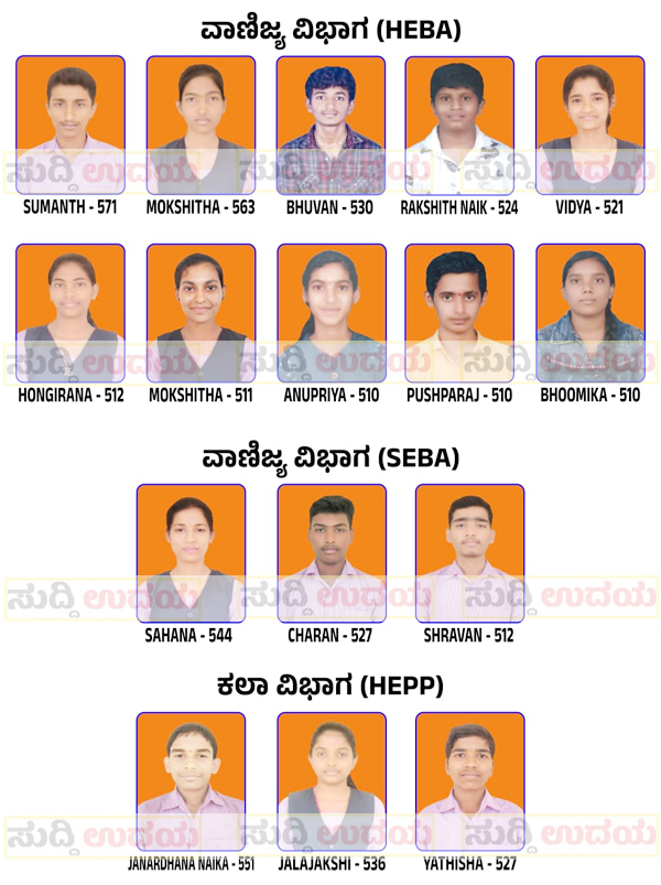 ಕಲಾ ವಿಭಾಗದಲ್ಲಿ ಜನಾರ್ಧನ ನಾಯ್ಕ 551, ಜಲಜಾಕ್ಷಿ 536, ಯತೀಶ 527 ಅಂಕಗಳನ್ನು ಪಡೆದು ವಿಶಿಷ್ಟ ಶ್ರೇಣಿಯಲ್ಲಿ ತೇರ್ಗಡೆಗೊಂಡಿದ್ದಾರೆ.
