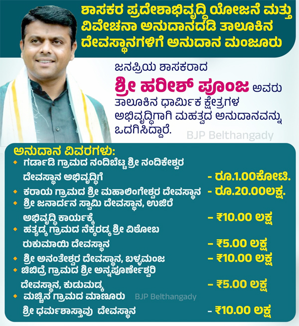 ಬೆಳ್ತಂಗಡಿ: ಶಾಸಕ ಹರೀಶ್ ಪೂಂಜರವರು ಶಾಸಕರ ಪ್ರದೇಶಾಭಿವೃದ್ಧಿ ಯೋಜನೆ ಮತ್ತು ವಿವೇಚನಾ ಅನುದಾನದಡಿ ತಾಲೂಕಿನ ಧಾರ್ಮಿಕ ಕ್ಷೇತ್ರಗಳ ಅಭಿವೃದ್ಧಿಗಾಗಿ ಅನುದಾನ ಒದಗಿಸಿದ್ದಾರೆ.