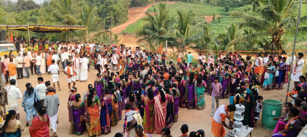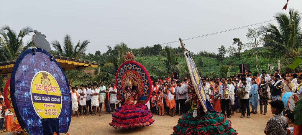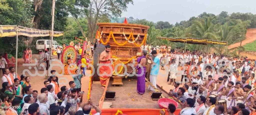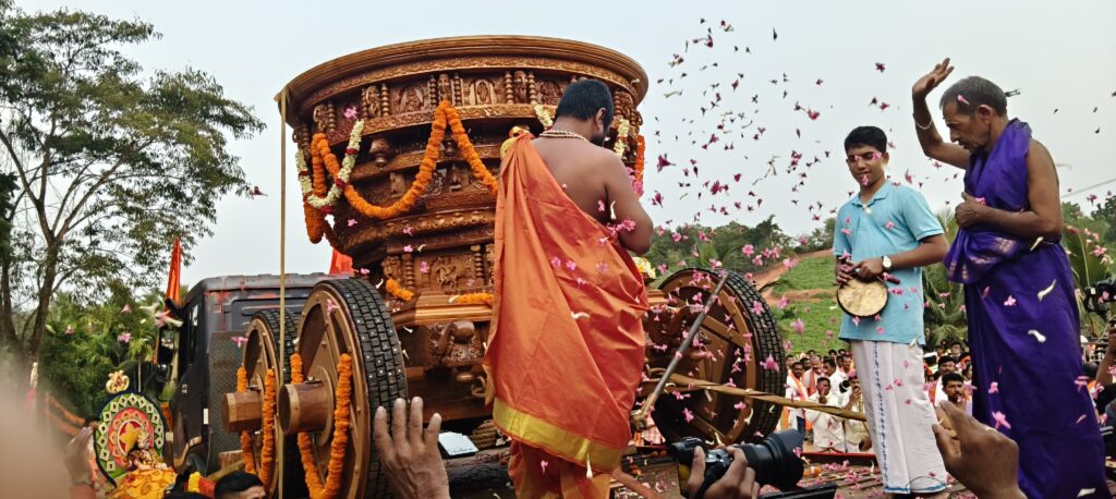 ಪೂರ್ಣಕುಂಭಸ್ವಾಗತ, ವೀರಗಾಸೆ, ಕೇರಳ ತೈಯಮ್, ಡೊಳ್ಳು ಕುಣಿತ, ವಾಯಲಿನ್, ಚೆಂಡೆ, ಭಜನ ತಂಡ, ಕೀಳು ಕುದರೆ, ವಾದ್ಯಗೋಷ್ಠಿಯಲ್ಲಿ ರಥವನ್ನು ದೇವಸ್ಥಾನಕ್ಕೆ ವೈಭವಪೂರ್ಣವಾಗಿ ತರಲಾಯಿತು. ನೂರಾರು ಸಂಖ್ಯೆಯಲ್ಲಿ ಭಕ್ತರು ರಥದ ಜತೆಯಲ್ಲಿ ಹೆಜ್ಜೆ ಹಾಕಿದರು. ಅಲ್ಲಲ್ಲಿ ಬ್ರಹ್ಮರಥಕ್ಕೆ ಪುರ್ಷ್ಪಾಚನೆ ನಡೆಸಲಾಯಿತು.