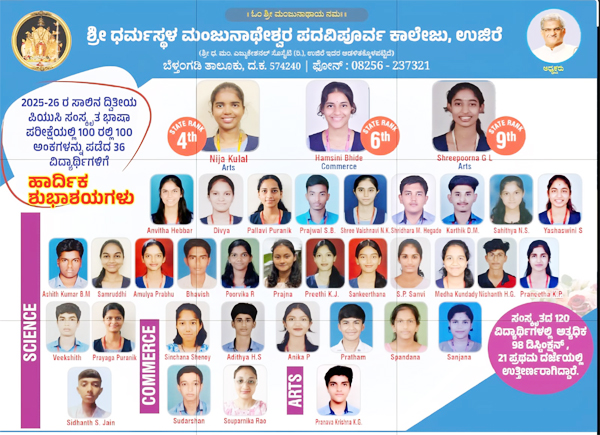 ಉಜಿರೆ: ದ್ವಿತೀಯ ಪಿಯುಸಿ ವಾರ್ಷಿಕ ಪರೀಕ್ಷೆಯಲ್ಲಿ ಉಜಿರೆಯ ಶ್ರೀ ಧರ್ಮಸ್ಥಳ ಮಂಜುನಾಥೇಶ್ವರ ಪದವಿಪೂರ್ವ ಕಾಲೇಜಿನ ಒಟ್ಟು ಮೂವತ್ತಾರು ವಿದ್ಯಾರ್ಥಿಗಳು ಸಂಸ್ಕೃತ ಭಾಷಾ ಪರೀಕ್ಷೆಯಲ್ಲಿ 100 ಕ್ಕೆ 100 ಅಂಕಗಳಿಸಿ ವಿಶೇಷ ಸಾಧನೆ ಮಾಡಿದ್ದಾರೆ.