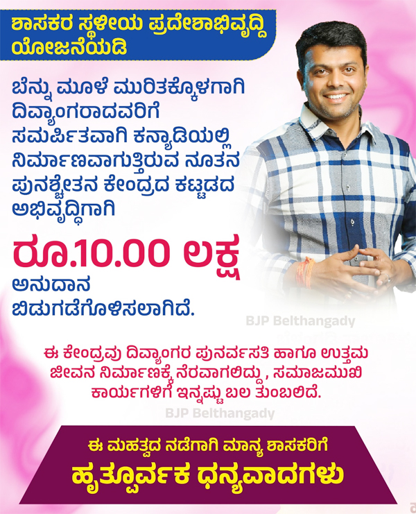 ಬೆಳ್ತಂಗಡಿ: ಶಾಸಕರ ಸ್ಥಳೀಯ ಪ್ರದೇಶಾಭಿವೃದ್ದಿ ಯೋಜನೆಯಡಿ ಬೆನ್ನು ಮೂಳೆ ಮುರಿತಕ್ಕೊಳಗಾಗಿ ದಿವ್ಯಾಂಗರಾದವರಿಗೆ ಸಮರ್ಪಿತವಾಗಿ ಕನ್ಯಾಡಿಯಲ್ಲಿ ನಿರ್ಮಾಣವಾಗುತ್ತಿರುವ ನೂತನ ಪುನಶ್ಚೇತನ ಕೇಂದ್ರದ ಕಟ್ಟಡದ ಅಭಿವೃದ್ಧಿಗಾಗಿ ರೂ.10ಲಕ್ಷ ಅನುದಾನ ಬಿಡುಗಡೆಗೊಳಿಸಲಾಗಿದೆ.