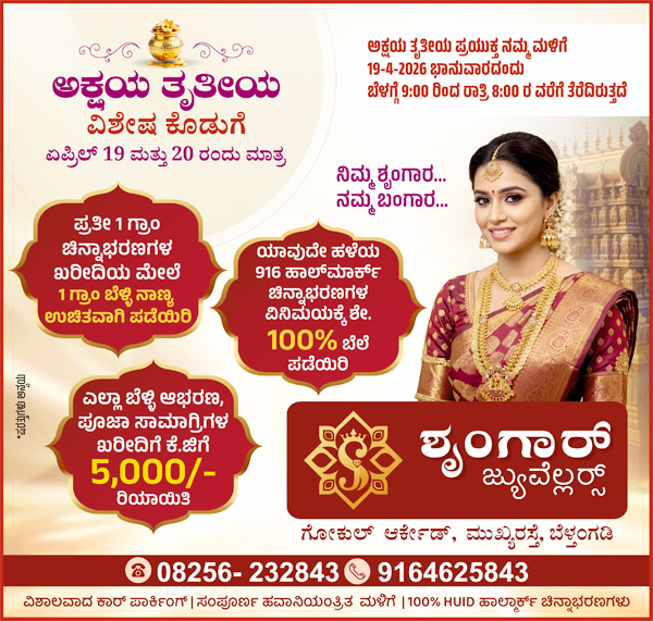 ವಿಶೇಷ ಕೊಡುಗೆಗಳು: ಅಕ್ಷಯ ತೃತೀಯದ ಪ್ರಯುಕ್ತ ಚಿನ್ನಾಭರಣ ಪ್ರಿಯರಿಗೆ ಶೃಂಗಾರ್ ಜುವೆಲ್ಲರ್ಸ್ ನಲ್ಲಿ ಪ್ರತೀ 1 ಗ್ರಾಂ ಚಿನ್ನಾಭರಣ ಖರೀದಿಯ ಮೇಲೆ 1 ಗ್ರಾಂ ಬೆಳ್ಳಿನಾಣ್ಯ ಉಚಿತವಾಗಿ ಪಡೆಯುವ ಅವಕಾಶವಿದೆ. ಎಲ್ಲಾ ಬೆಳ್ಳಿಯ ಆಭರಣ, ಪೂಜಾ ಸಾಮಾಗ್ರಿಗಳ ಖರೀದಿ ಮೇಲೆ 1 ಕೆಜಿಗೆ 5000 ರೂ. ರಿಯಾಯಿತಿ ಪಡೆಯಬಹುದಾಗಿದೆ. ಗ್ರಾಹಕರು ಯಾವುದೇ ತಮ್ಮ ಹಳೆಯ 916 ಹಾಲ್ ಮಾರ್ಕ್ ಚಿನ್ನಾಭರಣಗಳ ವಿನಿಮಯಕ್ಕೆ ಶೇ.100 ಬೆಲೆಯನ್ನು ಪಡೆಯುವ ಸುವರ್ಣಾವಕಾಶವನ್ನು ಕಲ್ಪಿಸಲಾಗಿದೆ.