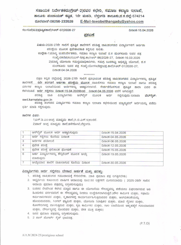 ಬೆಳ್ತಂಗಡಿ: ಸಮಾಜ ಕಲ್ಯಾಣ ಇಲಾಖೆಯಿಂದ ಪ್ರತಿಷ್ಠಿತ ಶಾಲೆಗಳಲ್ಲಿ 6ನೇ ತರಗತಿಗೆ ಪ್ರವೇಶ ಕಲ್ಪಿಸಲು ಪರಿಶಿಷ್ಟ ಜಾತಿಯ ವಿದ್ಯಾರ್ಥಿಗಳಿಂದ ಅರ್ಜಿ ಆಹ್ವಾನಿಸಲಾಗಿದೆ. ವಿದ್ಯಾರ್ಥಿಗಳು ಮೇ 4ರವರೆಗೆ ಸಮಾಜ ಕಲ್ಯಾಣ ಇಲಾಖೆಯ ಜಾಲತಾಣ (https://swdservices. karnataka.gov.in/Education Prestigious)ದಲ್ಲಿ ನೋಂದಾಯಿಸಬೇಕು. ನಂತರ ಅರ್ಜಿಯೊಂದಿಗೆ ದಾಖಲಾತಿಗಳನ್ನು ಸಮಾಜ ಕಲ್ಯಾಣ ಇಲಾಖೆ ಜಂಟಿ ನಿರ್ದೇಶಕರ ಕಚೇರಿಗೆ ಮೇ 5ರ ಸಂಜೆ 5.30ರೊಳಗೆ ಸಲ್ಲಿಸಬೇಕು.ಎಸ್.ಡಿ.ಎಂ ಆಂಗ್ಲ ಮಾಧ್ಯಮ ಶಾಲೆ (ಸಿ.ಬಿ.ಎಸ್.ಇ) ಉಜಿರೆ, ವಾಣಿ ಆಂಗ್ಲ ಮಾಧ್ಯಮ ಶಾಲೆ, ಹಳೇಕೋಟೆ ಬೆಳ್ತಂಗಡಿ ಇವು ಪ್ರತಿಷ್ಠಿತ ಶಾಲೆಗಳಾಗಿವೆ.