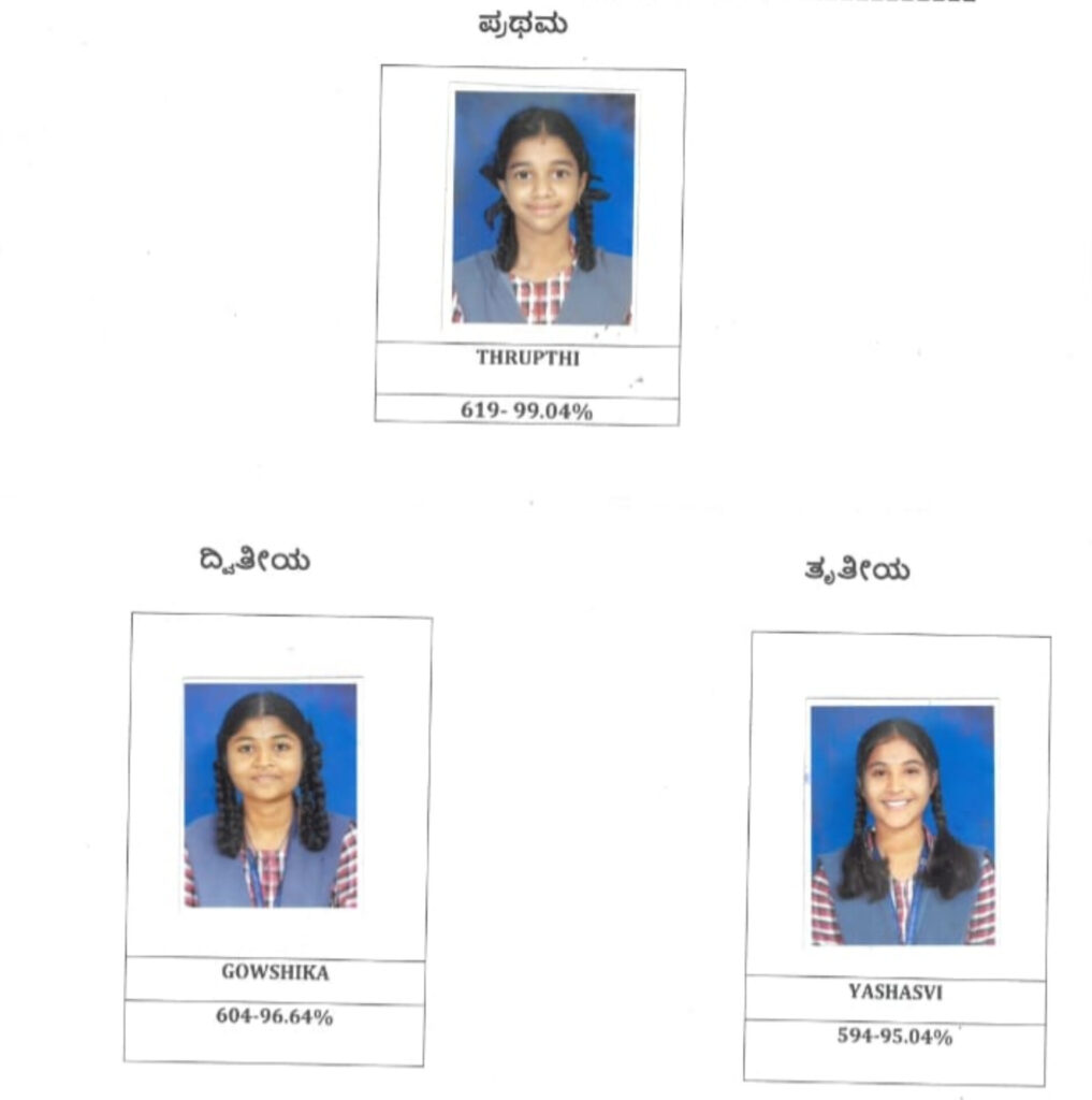 125 ವಿದ್ಯಾರ್ಥಿಗಳು ಪತೀಕ್ಷೆಗೆ ಹಾಜರಾಗಿದ್ದು ತೃಪ್ತಿ ಕೆ 619 ಅಂಕ ಗಳಿಸಿ, ರಾಜ್ಯಕ್ಕೆ 7ನೇ ರ‍್ಯಾಂಕ್ ಗಳಿಸಿ ಉತ್ತಮ ಸಾಧನೆ ಮಾಡಿದ್ದಾರೆ.ಗೌಶಿಕ 604,ಯಶಸ್ವಿ 594 ಅಂಕ ಗಳಿಸಿ ಶಾಲೆಗೆ ಕೀರ್ತಿ ತಂದಿದ್ದಾರೆ.