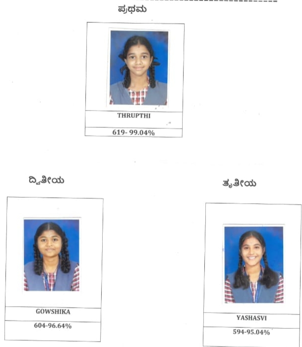 ಗೌಶಿಕ 604,ಯಶಸ್ವಿ 594 ಅಂಕ ಗಳಿಸಿ ಶಾಲೆಗೆ ಕೀರ್ತಿ ತಂದಿದ್ದಾರೆ.ಉತ್ತಮ ಫಲಿತಾಂಶದೊಂದಿಗೆ ಶಾಲೆಗೆ ಕೀರ್ತಿ ತಂದ ವಿದ್ಯಾರ್ಥಿಗಳನ್ನು ಪ್ರಾಂಶುಪಾಲರು ಮತ್ತು ಆಡಳಿತ ಮಂಡಳಿ ಅಭಿನಂದಿಸಿದೆ.