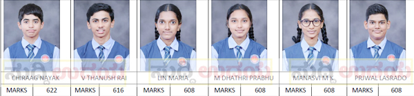 ಚಿರಾಗ್ ನಾಯಕ್ 622 ಅಂಕ ಪಡೆದು ರಾಜ್ಯದಲ್ಲಿ 4ನೇ ಸ್ಥಾನ, ತಾಲೂಕಿಗೆ ಮತ್ತು ಶಾಲೆಗೆ ಪ್ರಥಮ ಸ್ಥಾನ ಪಡೆದಿದ್ದಾರೆ. ವಿ. ತನುಷ್ ರೈ 616 ಅಂಕ ಪಡೆದು ದ್ವಿತೀಯ, ಲೀನ್ ಮರಿಯ 608, ಎಂ. ಧಾತ್ರಿ ಪ್ರಭು 608, ಮನಸ್ವಿ ಎಂ.ಕೆ. 608, ಪ್ರಜ್ವಲ್ ಲಸ್ರಾದೋ 608 ಅಂಕಗಳೊಂದಿಗೆ ಶಾಲೆಗೆ ತೃತೀಯ ಸ್ಥಾನ ಪಡೆದಿದ್ದಾರೆ.
