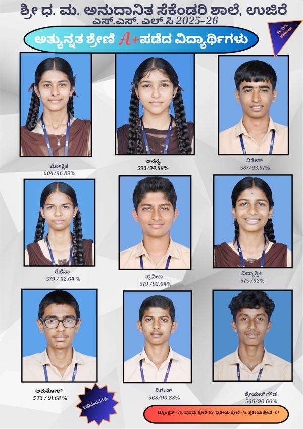 ಉಜಿರೆ :2025-26ನೇ ಸಾಲಿನ ಎಸ್ ಎಸ್ ಎಲ್ ಸಿ ಪರೀಕ್ಷೆಯಲ್ಲಿ ಉಜಿರೆ ಧ. ಮ. ಅನುದಾನಿತ ಸೆಕೆಂಡರಿ ಶಾಲೆ 99.29% ಫಲಿತಾಂಶ ದಾಖಲಿಸಿದೆ