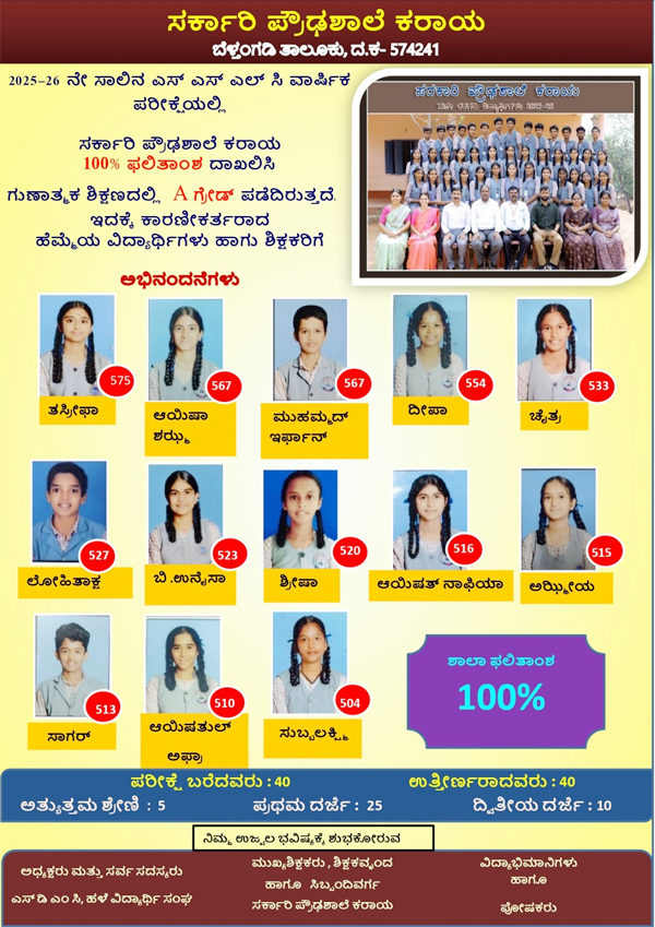 ಕರಾಯ: 2025-26ನೇ ಸಾಲಿನ ಎಸ್ಸೆಸ್ಸೆಲ್ಸಿ ಫಲಿತಾಂಶ ಪ್ರಕಟಗೊಂಡಿದ್ದು, ಕರಾಯ ಸರಕಾರಿ ಪ್ರೌಢಶಾಲೆಯ ಪರೀಕ್ಷೆಗೆ ಹಾಜರಾದ 40 ವಿದ್ಯಾರ್ಥಿಗಳಲ್ಲಿ 40 ವಿದ್ಯಾರ್ಥಿಗಳು ಉತ್ತೀರ್ಣರಾಗಿ ಶೇ.100 ಫಲಿತಾಂಶ ದಾಖಲಾಗಿದೆ. ಗುಣಾತ್ಮಕ ಶಿಕ್ಷಣದಲ್ಲಿ ಎ ಗ್ರೇಡ್ ಪಡೆದಿದೆ.